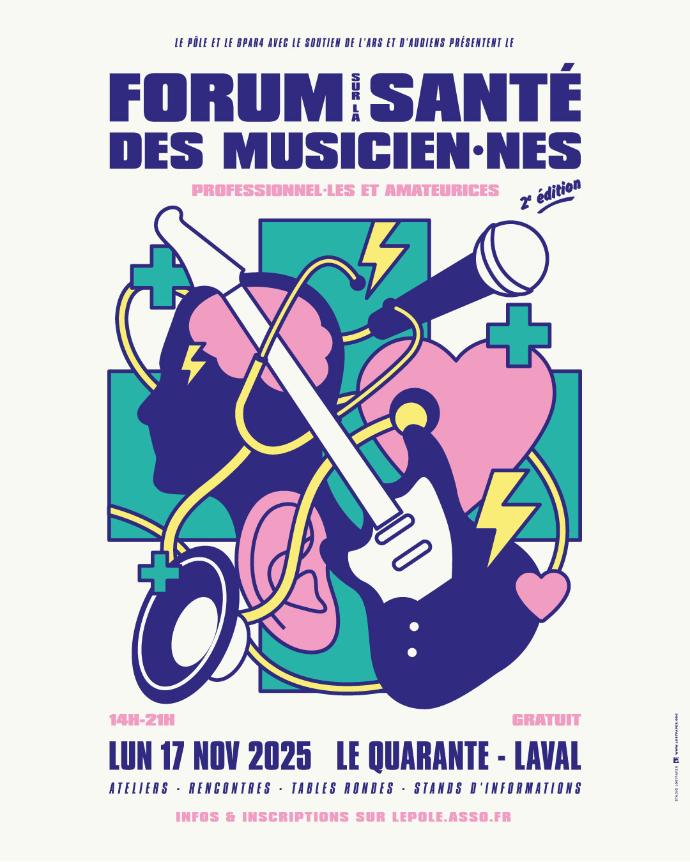 Avec le soutien de l'Agence Régionale de Santé et d’Audiens, le Pôle de coopération pour la filière musicale et le 6PAR4 organisent la seconde édition du Forum Santé dédié aux musicien.nes (professionnel·les et amateurices) des Pays de la Loire le 17 novembre 2025 de 14h à 21h au Quarante à Laval. Au programme, des ateliers et échanges sur les risques auditifs, la santé mentale, la posturologie, la voix ou encore le handicap … pour prendre soin des artistes s'informer et s'outiller !